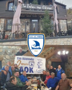 Στο “Στέκι της Ελένης”, τους υποδέχτηκε με αληθινή καβαλιώτικη αγάπη ο Σάββας από τη γνωστή ψαροταβέρνα στα Σφαγεία. Μαζί με τον Γιώργο Θεοφυλακτίδη και τη σύζυγό του Εύα, η παρέα αντάλλαξε ευχές και στήριξη για το αγαπημένο μας «καραβάκι».